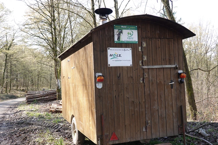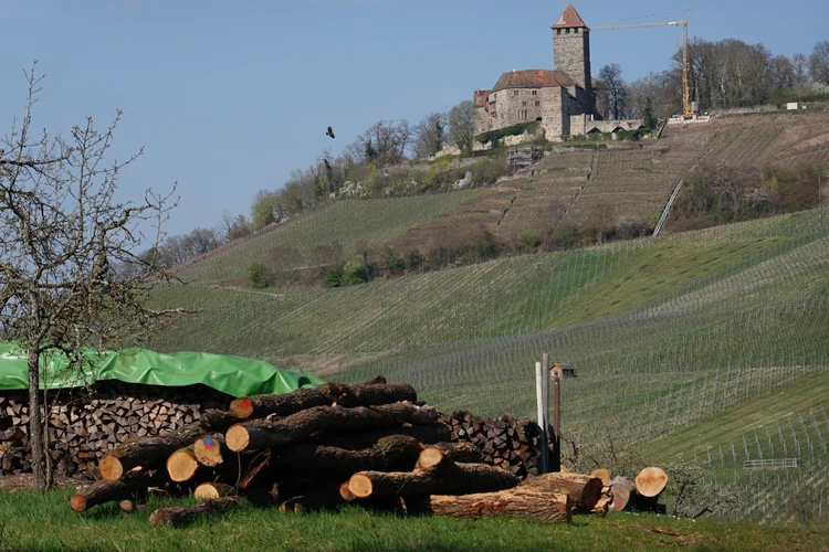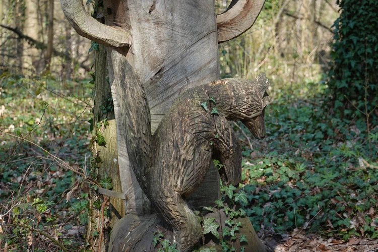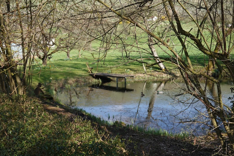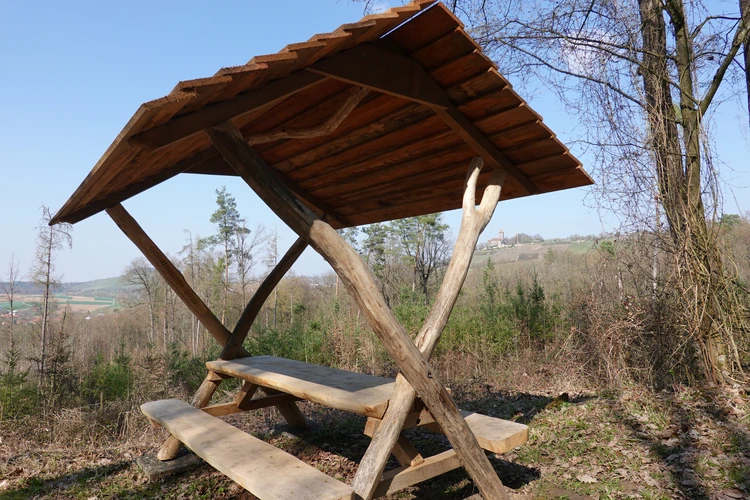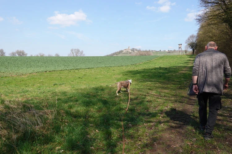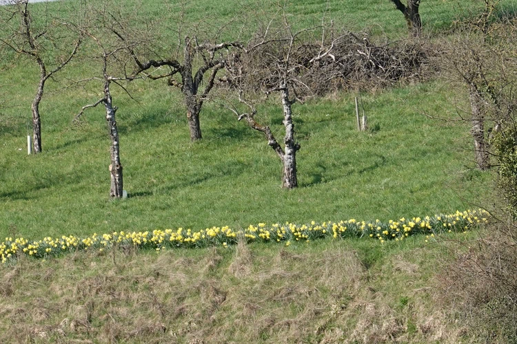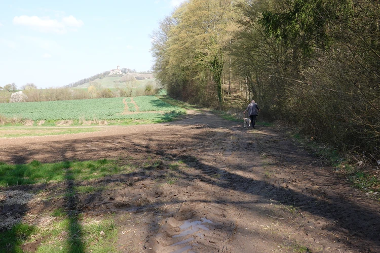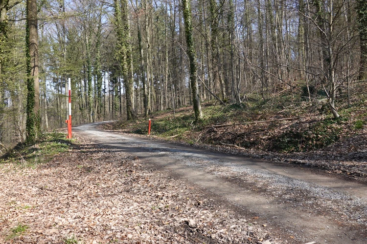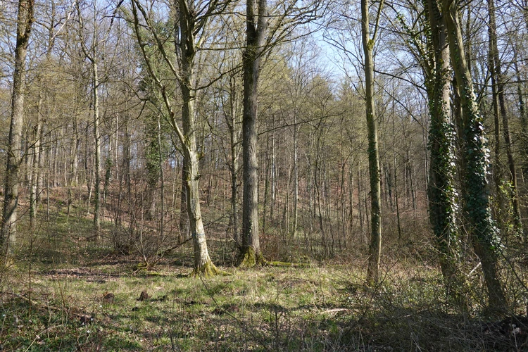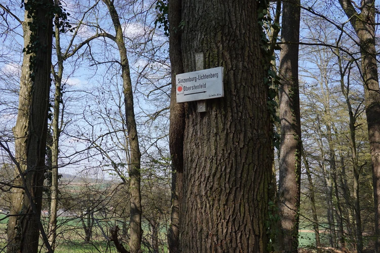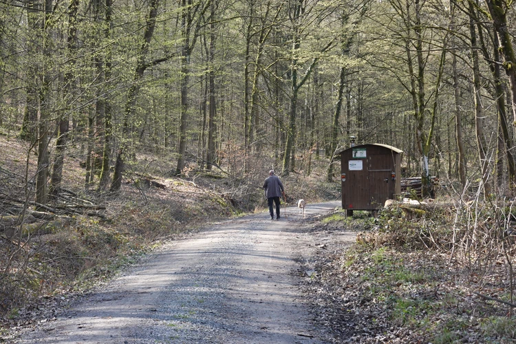 … hier auf die Burg Lichtenberg.Der Hund ist natürlich immer dabei.Holzfällungen sind nun, Ende März, abgeschlossen.Hier hatte jemand kreativen Natursinn.Noch sind es nur grüne Schleiher, die sich auf den Wald legen, …… Frühling ist nur erahnbar.Literarische Gedenktafel im Wald zu Ehren von Matern Feuerbacher, der um 1480 in Großbottwar geboren wurde.Burg Beilstein in der Ferne, und davor …… eine Pose zur Erinnerung.Nun ja, im Frühjahr gehört Matsch unbedingt dazu.Nichts als wohltuende Ruhe.…Wandern ohne Worte.Wir finden unseren Hund ganz toll, und irgendwo …… sind dann doch schon die Farben des Frühlings da.Kennst Du den Unterschied zwischen Mispel und Mistel? Zwei völlig unterschiedliche Pflanzen. Die Mispel ist eine kaum mehr vorkommende Obstsorte, verwandt mit Äpfeln, Birnen und Quitten, die für Most und zum Backen verwendet wurde. Heute kennt sie fast niemand mehr. Die Mistel hingegen begegnet uns häufig als ein halbschmarotzender Strauch, der als Baumparasit (z.B. auf Apfelbäumen) wächst und weiße Beeren trägt. Also klar, um was es sich hier handelt?Die Wolkenschleiher sind verzogen – tiefblauer Himmel. Nach einem geräuschlosen Segelflieger, knattert ein kleiner Motorflieger über uns hinweg.Buschwindröschen schieben sich als weiße Blüher aus dem vertrockneten Laub des Waldbodens.Bussarde, oft auch Milane (dann am Schwalbenschwanz zu erkennen), ziehen Kreise.Wieder zurück am letzten Haus von Lembach, das an den Wald grenzt und noch seinen eigenen Teich hat.Die kleine Wanderung heute, vielleicht 4 km lang, zeigt, dass auch Sackgassen ihre Überraschungen vorhalten 🙂